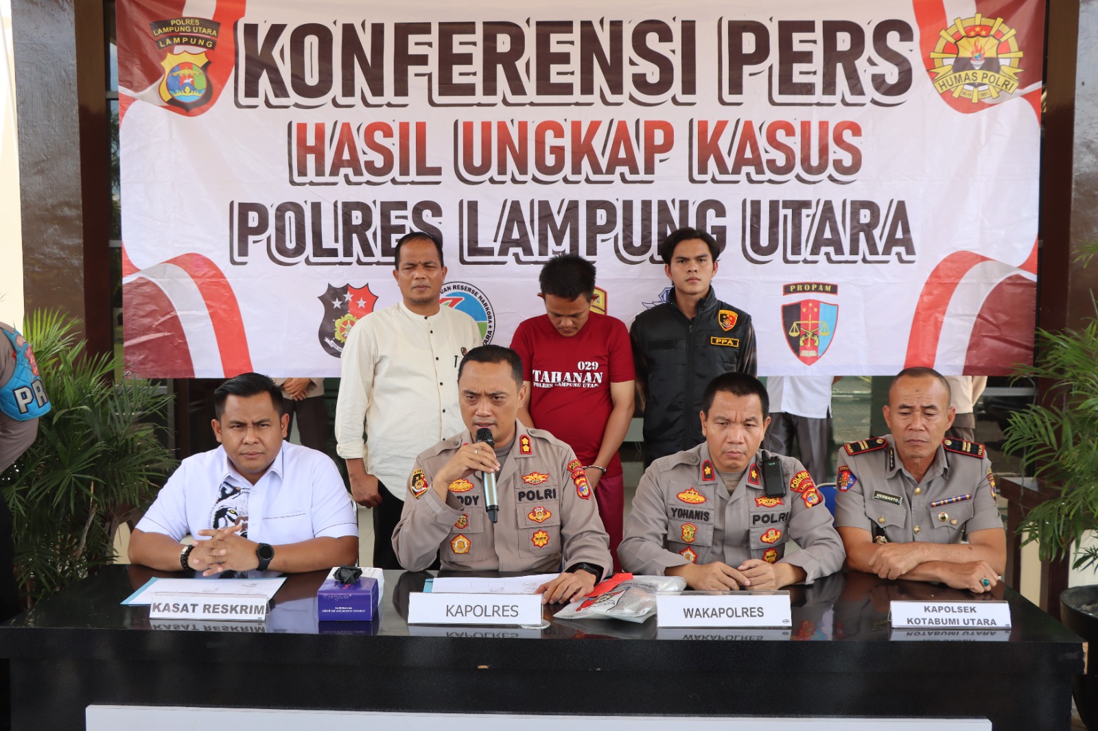 “Alhamdulillah kurang dari dua jam setelah korban ditemukan, tim Tekab 308 Polres Lampung Utara berhasil mengamankan pelaku,” kata Kapolres AKBP Deddy saat menggelar Konferensi Pers didampingi Waka Polres Kompol Yohanis, Kasat Reskrim AKP Apfryyadi dan Kapolsek Kotabumi Utara Iptu Hermanto, Jumat (22/8/2025).